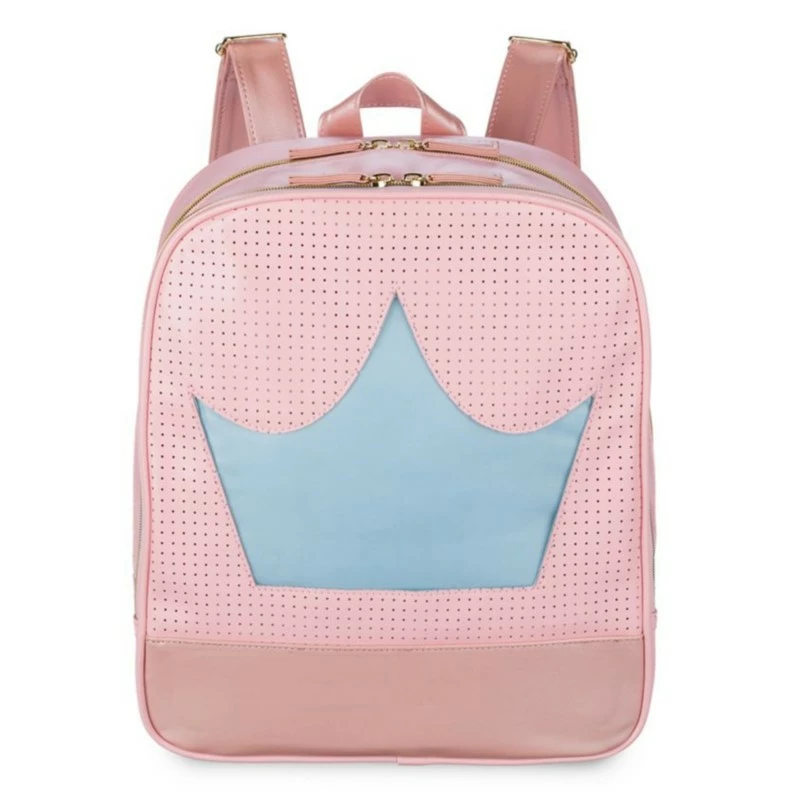 A large blue crown tops off the regal design of this Disney Princess backpack. Fashioned from simulated metallic pink leather, the perforated front panel has a die-cut opening for the contrasting crown, while the interior has space enough for a trove of treasures!