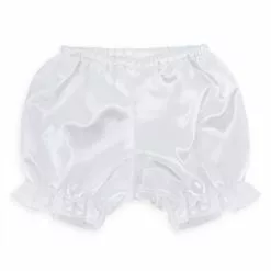 - Includes satin bloomers with ruffled cuffs
