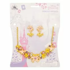 Lend a touch of sunshine to any Tangled costume with this breathtaking jewellery set designed to complement our Rapunzel costume collection. A golden necklace with floral filigree and faceted gems is matched by floral earrings with Pascal bobs.